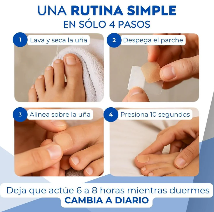 Solo necesitas limpiar bien la zona afectada, secarla completamente y aplicar el parche sobre la uña dañada. Sin complicaciones, sin cremas pegajosas ni malos olores.